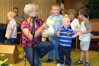 We do lots of fun things with our Sunday School class at Church. Beau shared his bunny with us. It sings "If You're Happy and You Know It". We liked singing it so much, they let us do a special for the whole church and the Spanish church next door. I really just wanted to sing into the microphone, but we all had to share the mic.